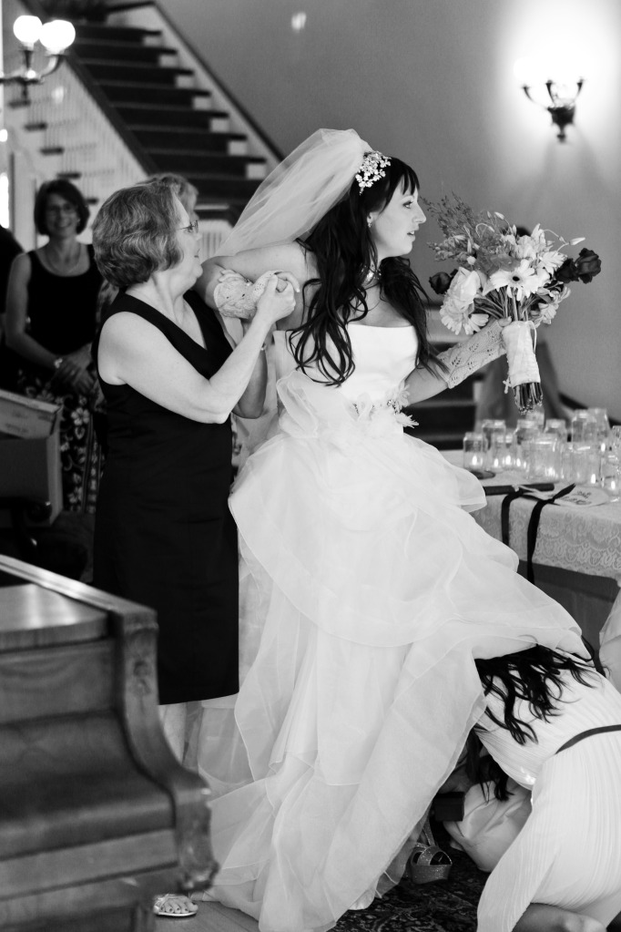 Although our wedding budget was tight, Bryce and I picked up a few extra jobs so I could have the perfect dress! I have driven by Priscilla of Boston more times than I could image and I was in love with their wedding dresses. When it was finally my turn to go dress shopping, I fell in love with the Vera Wang Erin dress. It was waayyy out of my budget, but I knew I had to have it, so I did! Although I had planned on wearing two different shoes throughout the evening, one sparkly pair was for the ceremony (wedges for the grass) and my Christian Louboutins for the reception, I ended up going barefoot the entire time and loved every minute of it. You see, I am a barefoot kind of girl and I didn’t want to do anything for the wedding that wasn’t a representation of my husband and me. We bought canning jars and my sister helped me to place stickers on them with a Grateful Dead quote that doubled as glasses and favors for the guests. ….The vintage music sheets I made the pennant banners out of came from a co-worker’s mother and my students help me cut them and glue them onto string.