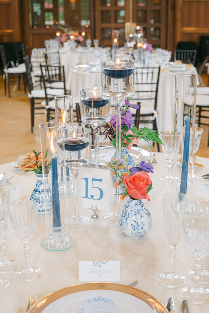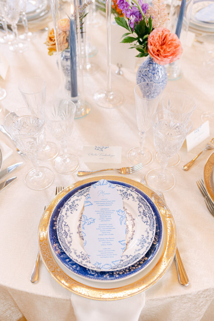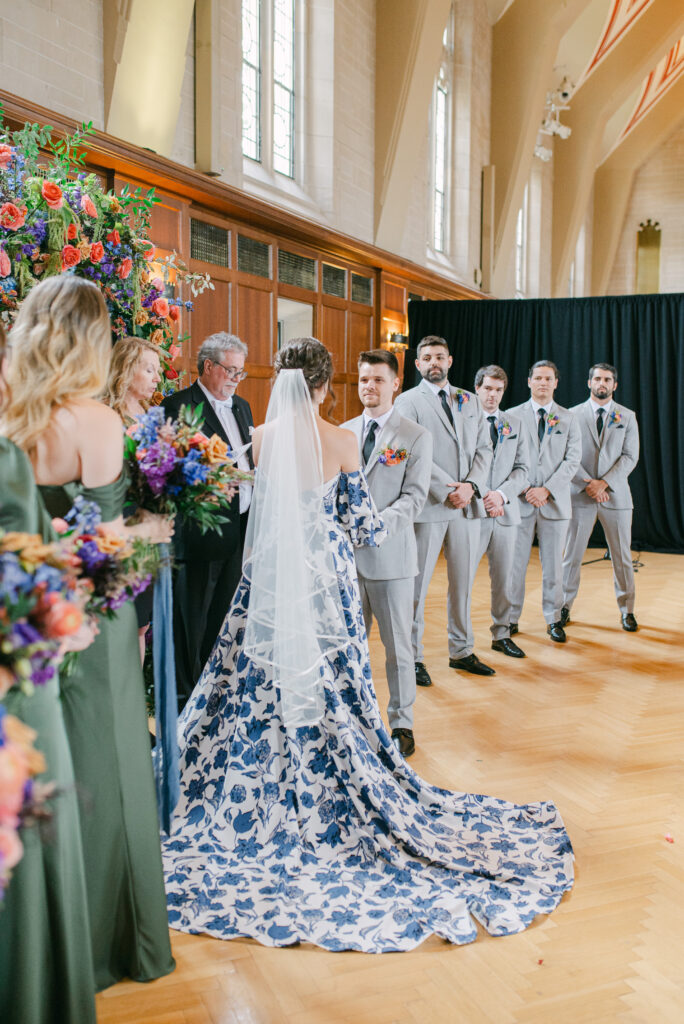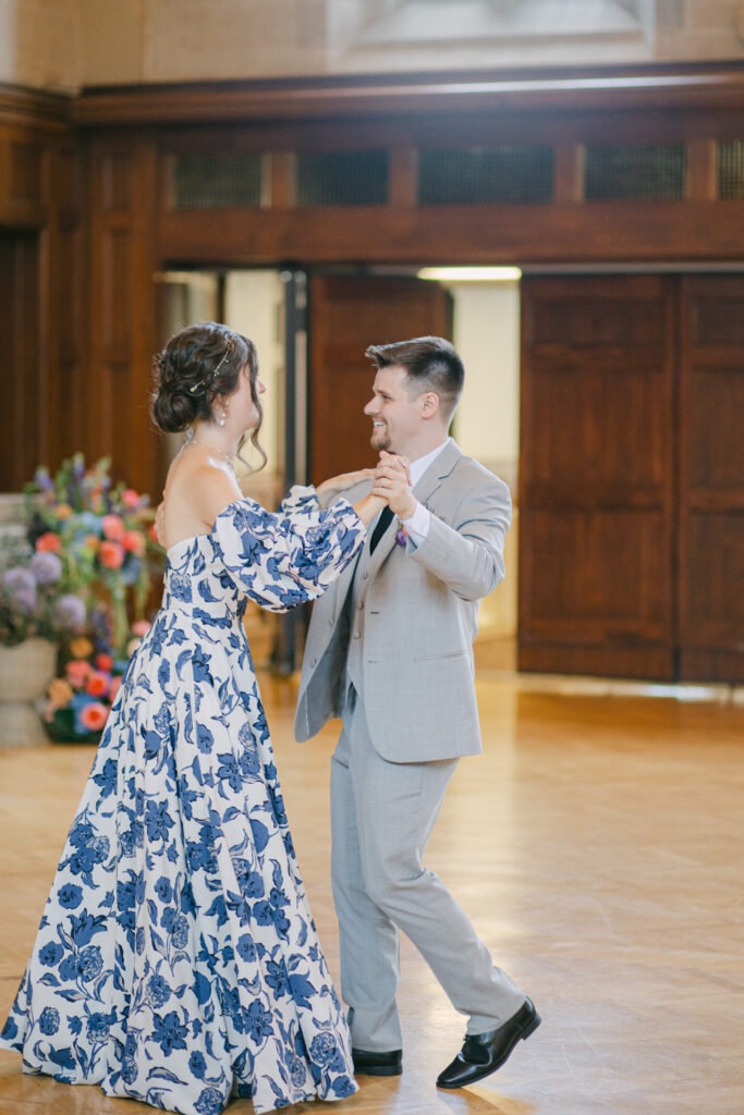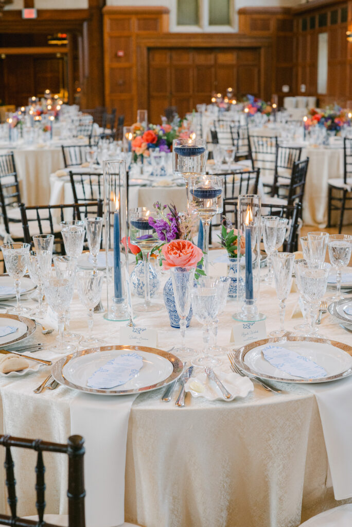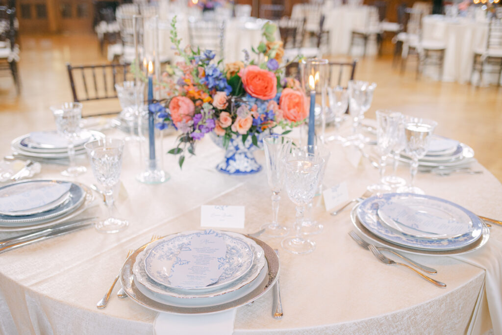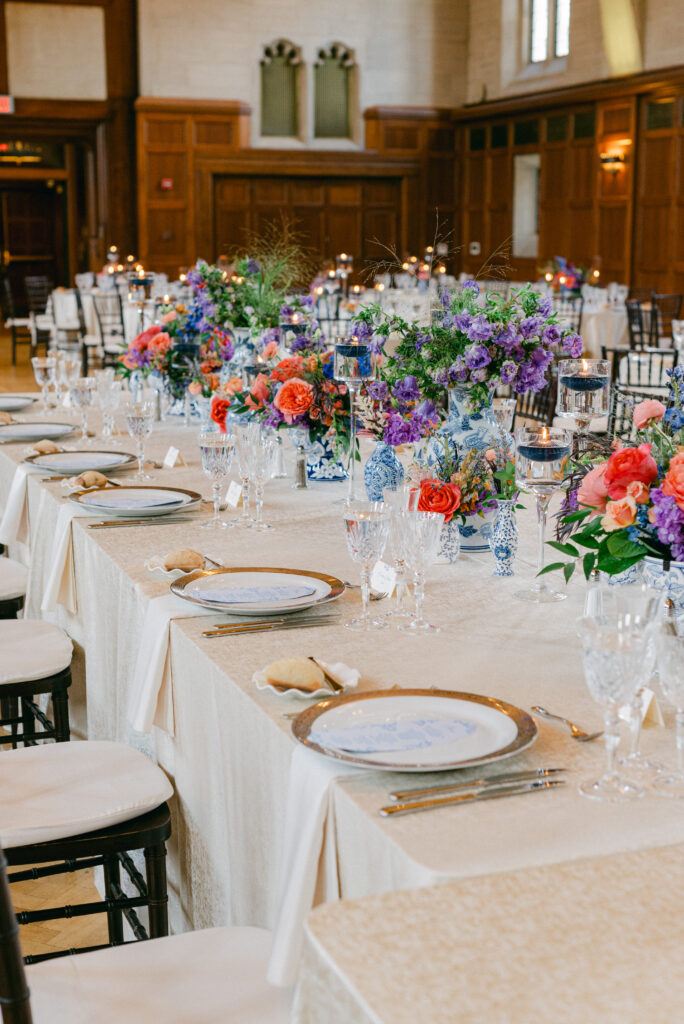 Set in the historic charm of Indiana University Alumni Hall, this vibrant summer 2025 wedding blended timeless architecture with fresh, colorful design. The reception tables were layered with elegant linens, gold-rimmed place settings, and blue-and-white chinoiserie vases overflowing with lush blooms in shades of coral, lavender, and soft blue perfectly designed by Pomp & Bloom.
