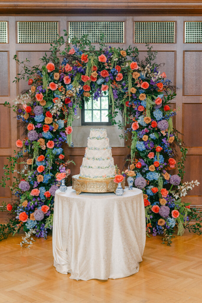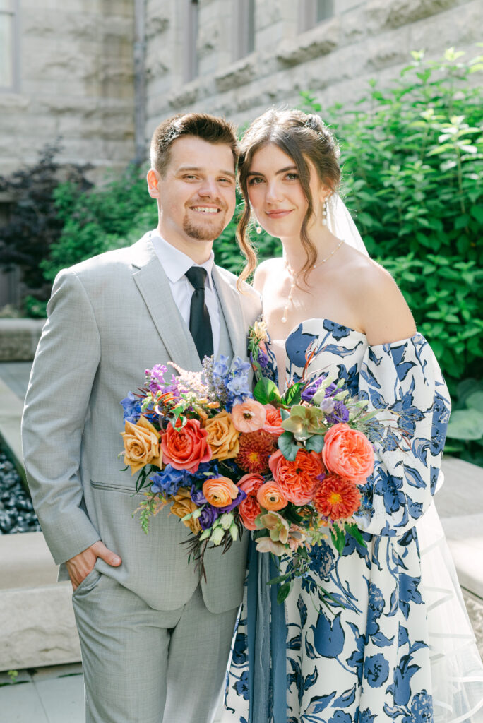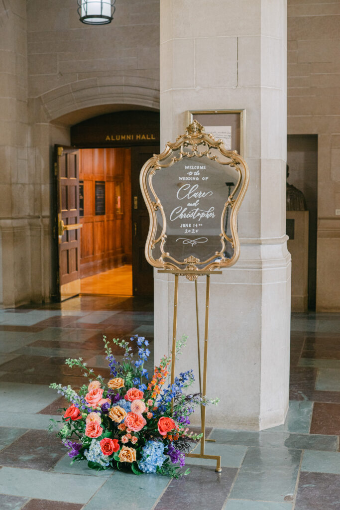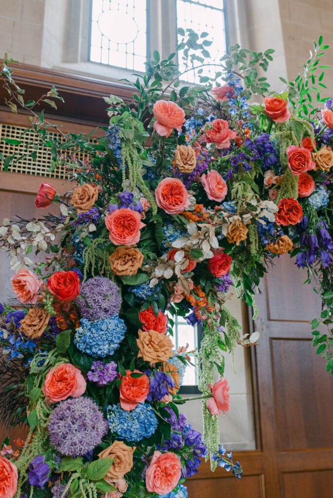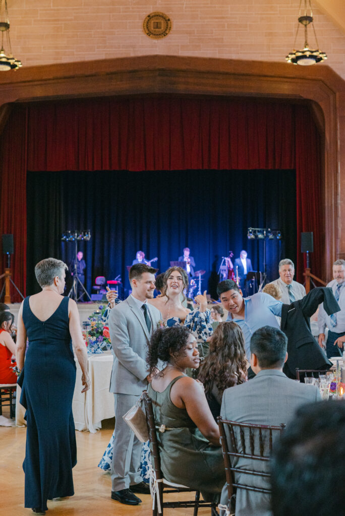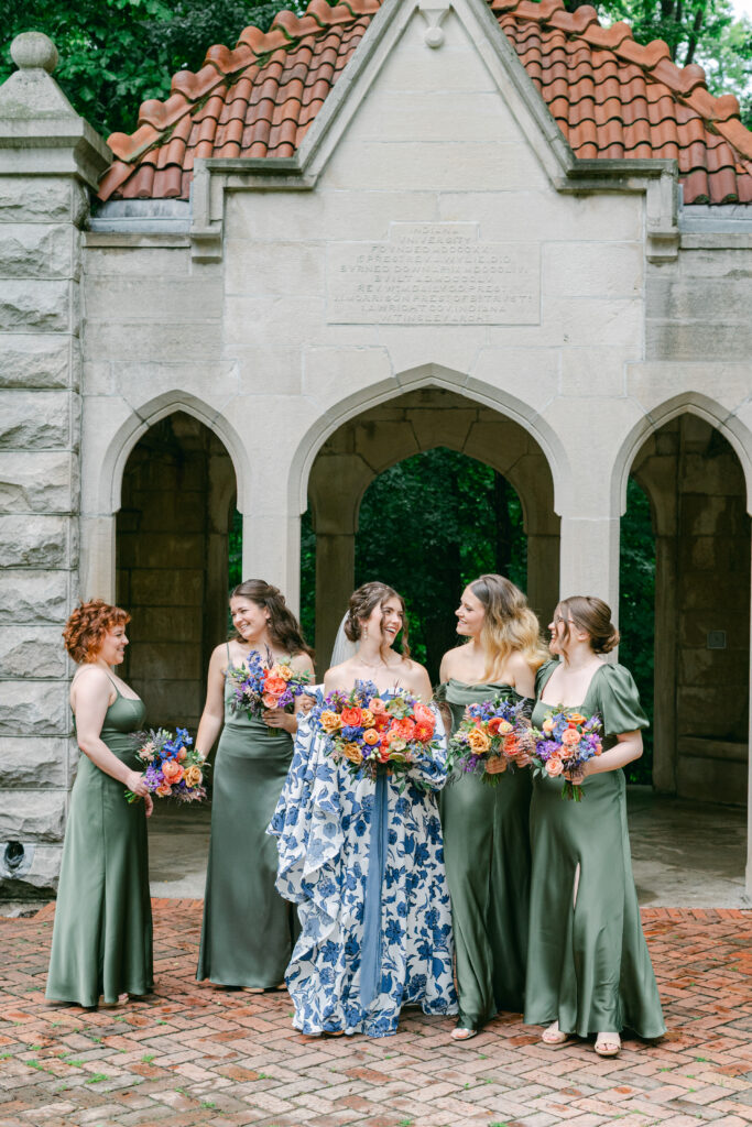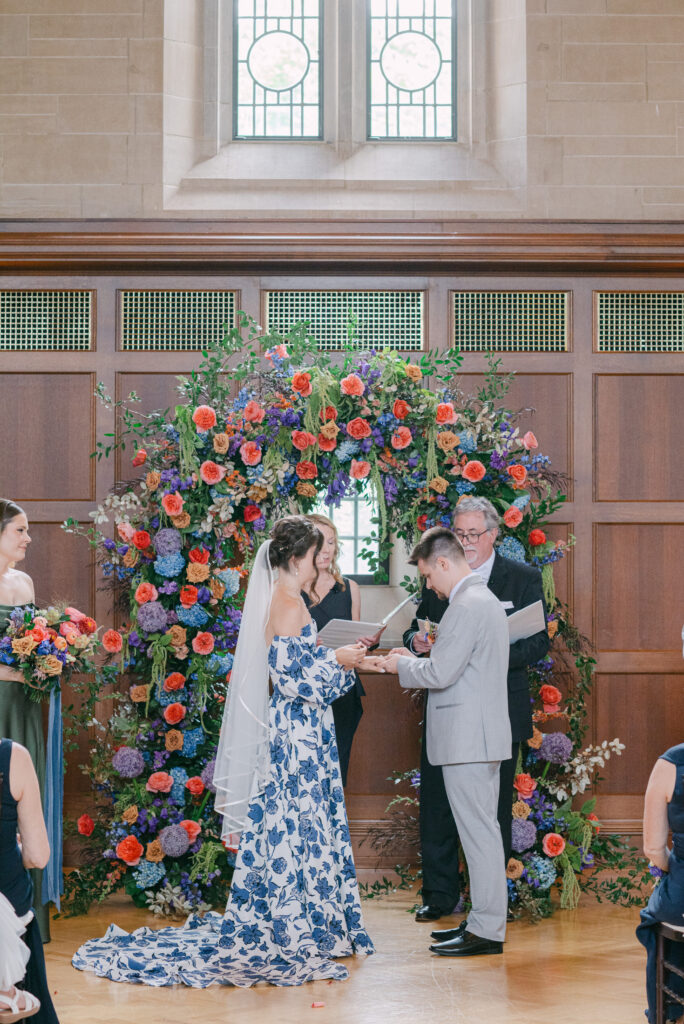 Set in the historic charm of Indiana University Alumni Hall, this vibrant summer 2025 wedding blended timeless architecture with fresh, colorful design. The reception tables were layered with elegant linens, gold-rimmed place settings, and blue-and-white chinoiserie vases overflowing with lush blooms in shades of coral, lavender, and soft blue perfectly designed by Pomp & Bloom.