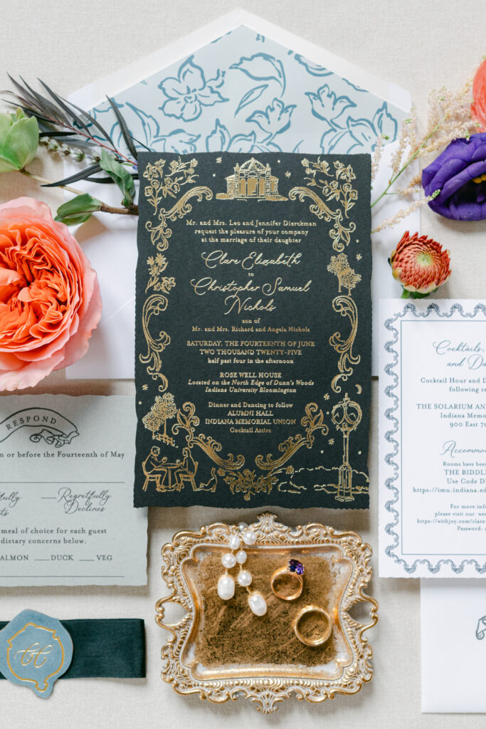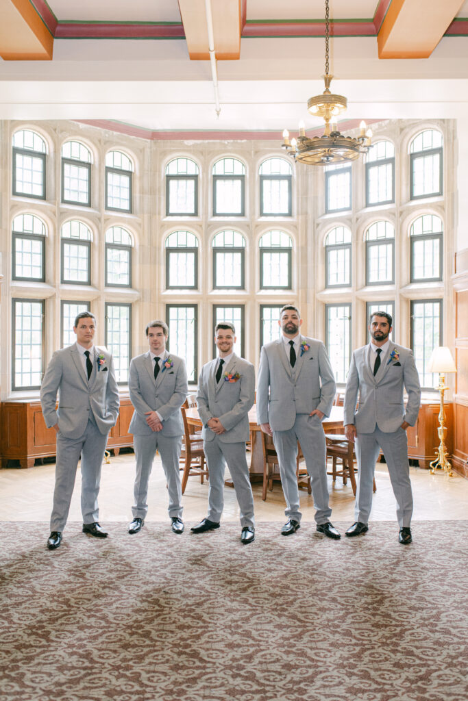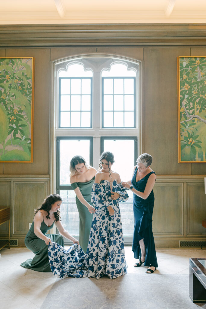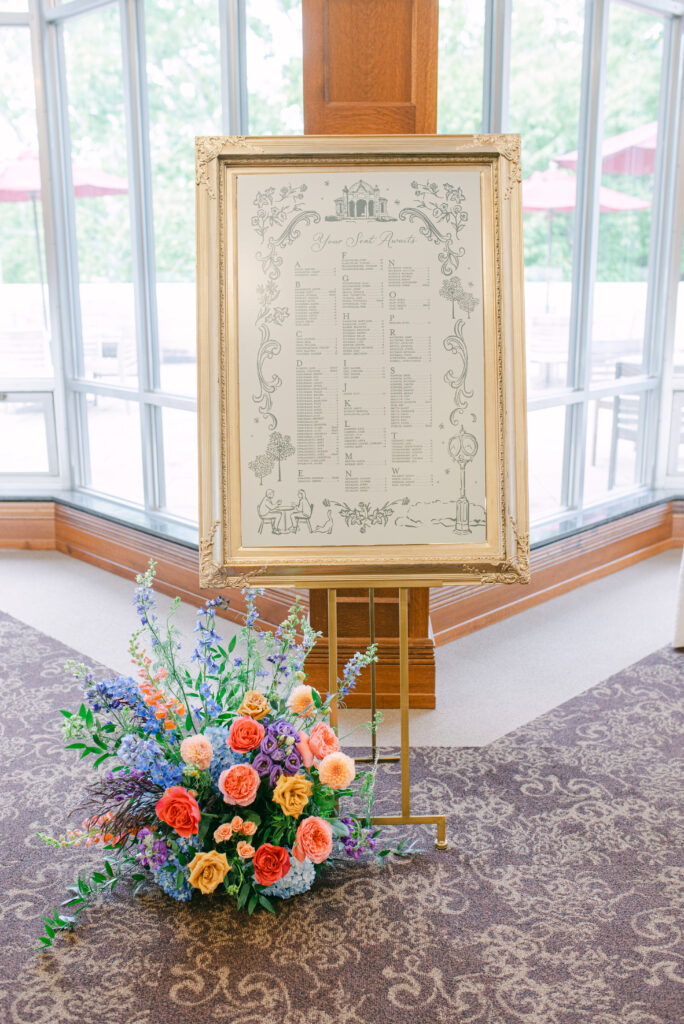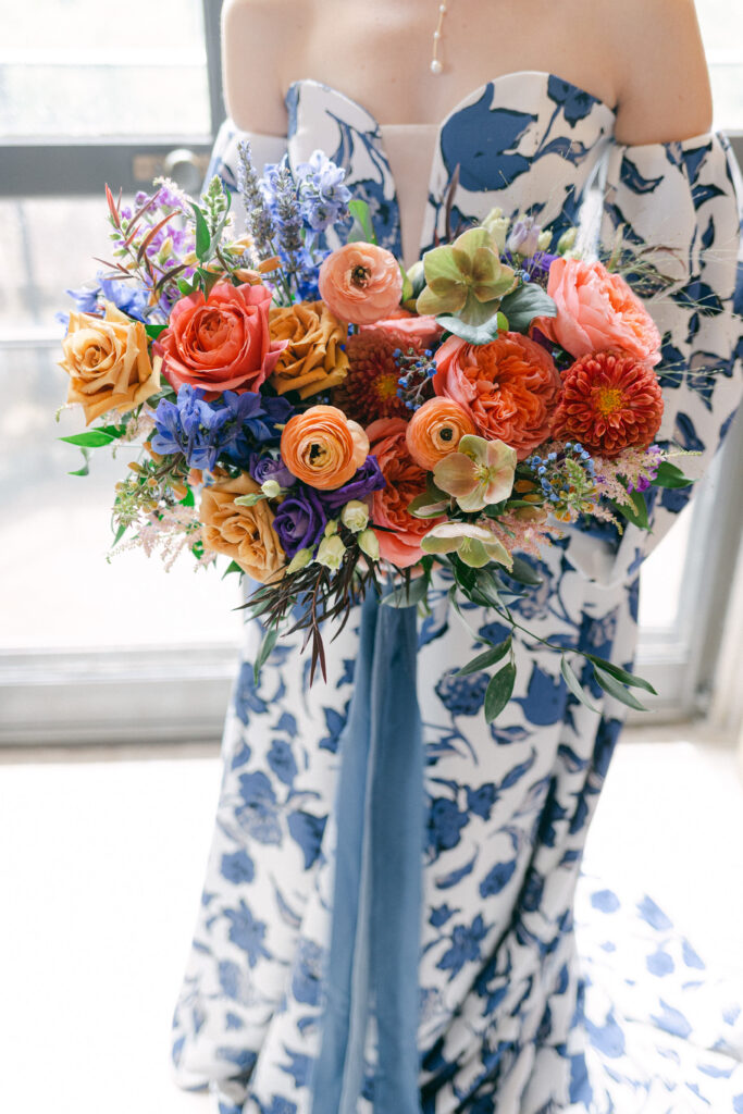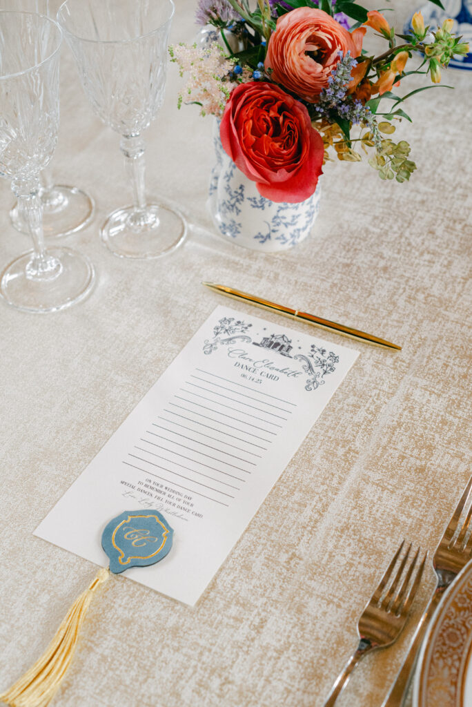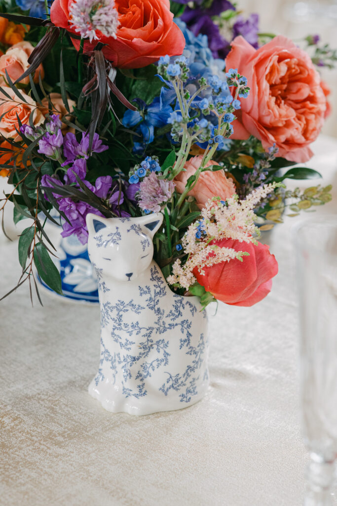 Set in the historic charm of Indiana University Alumni Hall, this vibrant summer 2025 wedding blended timeless architecture with fresh, colorful design. The reception tables were layered with elegant linens, gold-rimmed place settings, and blue-and-white chinoiserie vases overflowing with lush blooms in shades of coral, lavender, and soft blue perfectly designed by Pomp & Bloom.