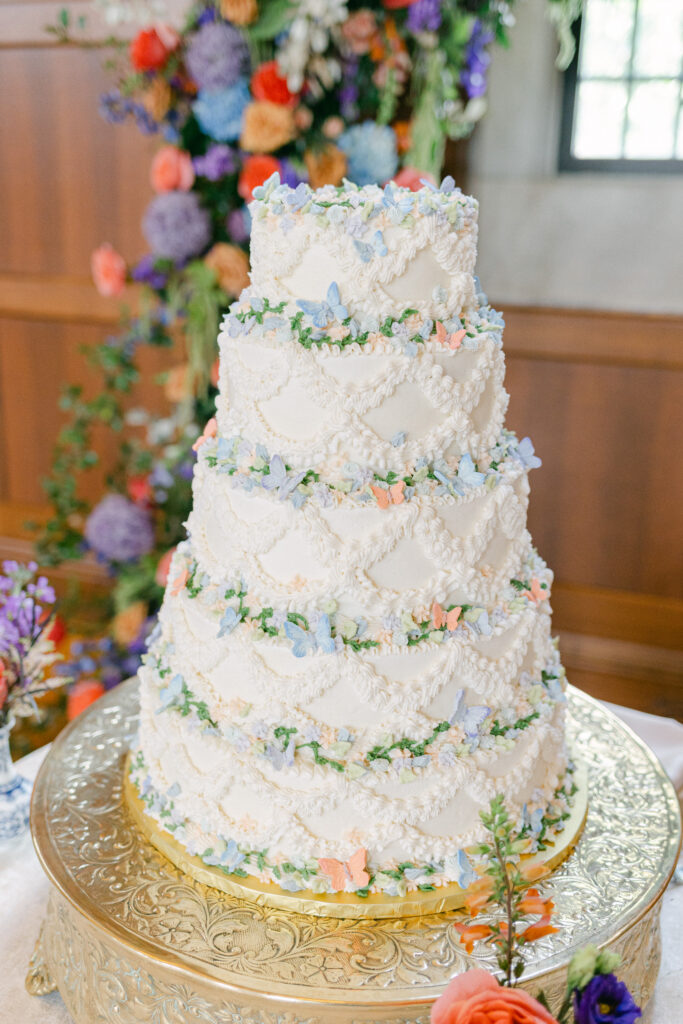During the ceremony, the couple made their joyful entrance beneath the hall’s soaring windows, surrounded by abundant florals that brought a garden-inspired feel indoors. The celebration continued with a stunning multi-tier cake adorned with delicate pastel butterflies, perfectly echoing the romantic, whimsical palette that carried throughout the day. Together, the thoughtful details and bright summer florals created a joyful, sophisticated celebration that felt both classic and uniquely personal. Hope you enjoy these beautiful photos by Kristen Bowen Photography!